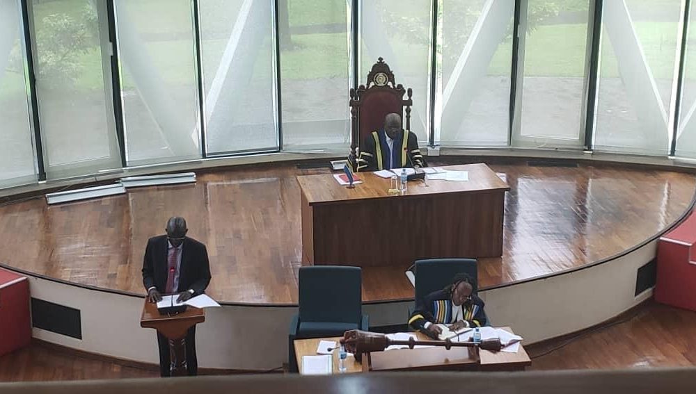 Hon. Gideon Gatpan Thoar, Chairperson of the EALA Committee on Agriculture and Natural Resources, presenting during a plenary sitting of the Assembly.