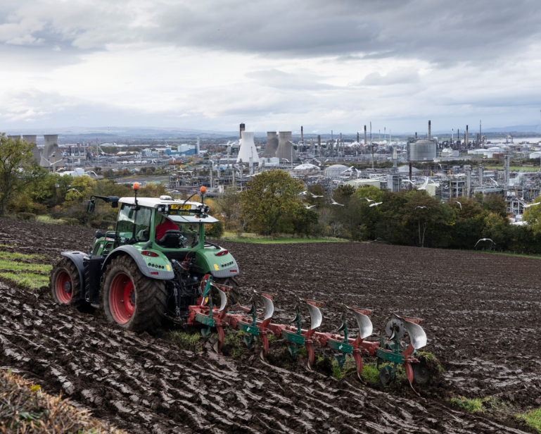 A farm worker ploughs fields overlooking Grangemouth petrochemical and refining plant in Scotland. Photograph: Murdo MacLeod/The Guardian